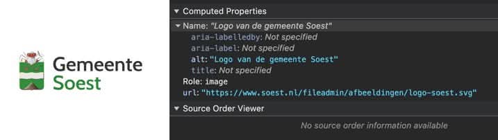 Bovenaan de website staat het logo van de gemeente Soest in een link die teruggaat naar de homepage. De afbeelding heeft als alt tekst "Logo van gemeente Soest". Hoewel dit beschrijvend is voor de daadwerkelijk afbeelding, biedt dit geen juiste beschrijving voor het doel van de link. Er is een title attribuut met "naar homepage" maar dit wordt niet door alle screen readers voorgelezen. Pas de alt tekst van het logo aan naar "gemeente Soest, naar homepage".