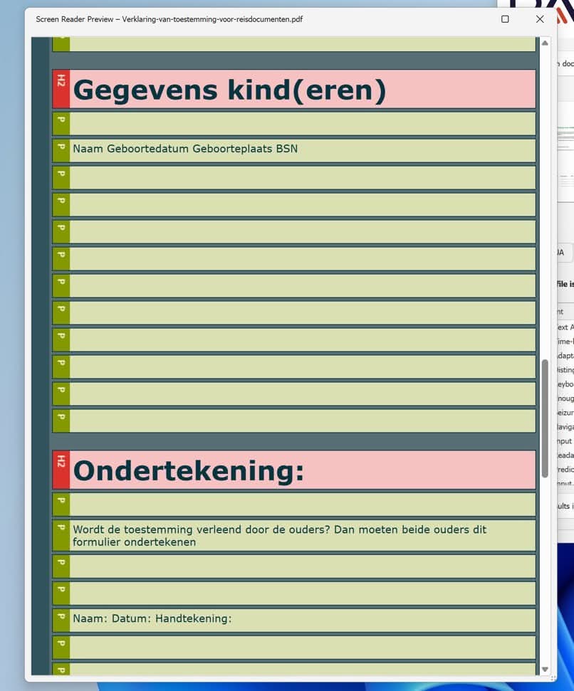 De informatie in de onderzochte formulieren is in principe wel toegankelijk voor screen readers, maar soms is de structuur die gebruik is mogelijk toch onduidelijk.