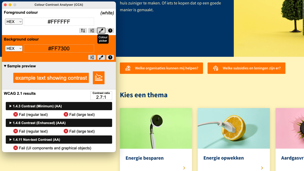 Er worden oranje knoppen met witte tekst gebruikt. Met de gebruikte tekstgrootte en dikte is een minimaal contrast van 4.5:1 nodig. Gemeten is echter een waarde van 2.7:1. Deze combinatie zou ook voor grotere of dikgedrukte tekst, waar een minimale waarde van 3:1 nodig is, onvoldoende contrast leveren.