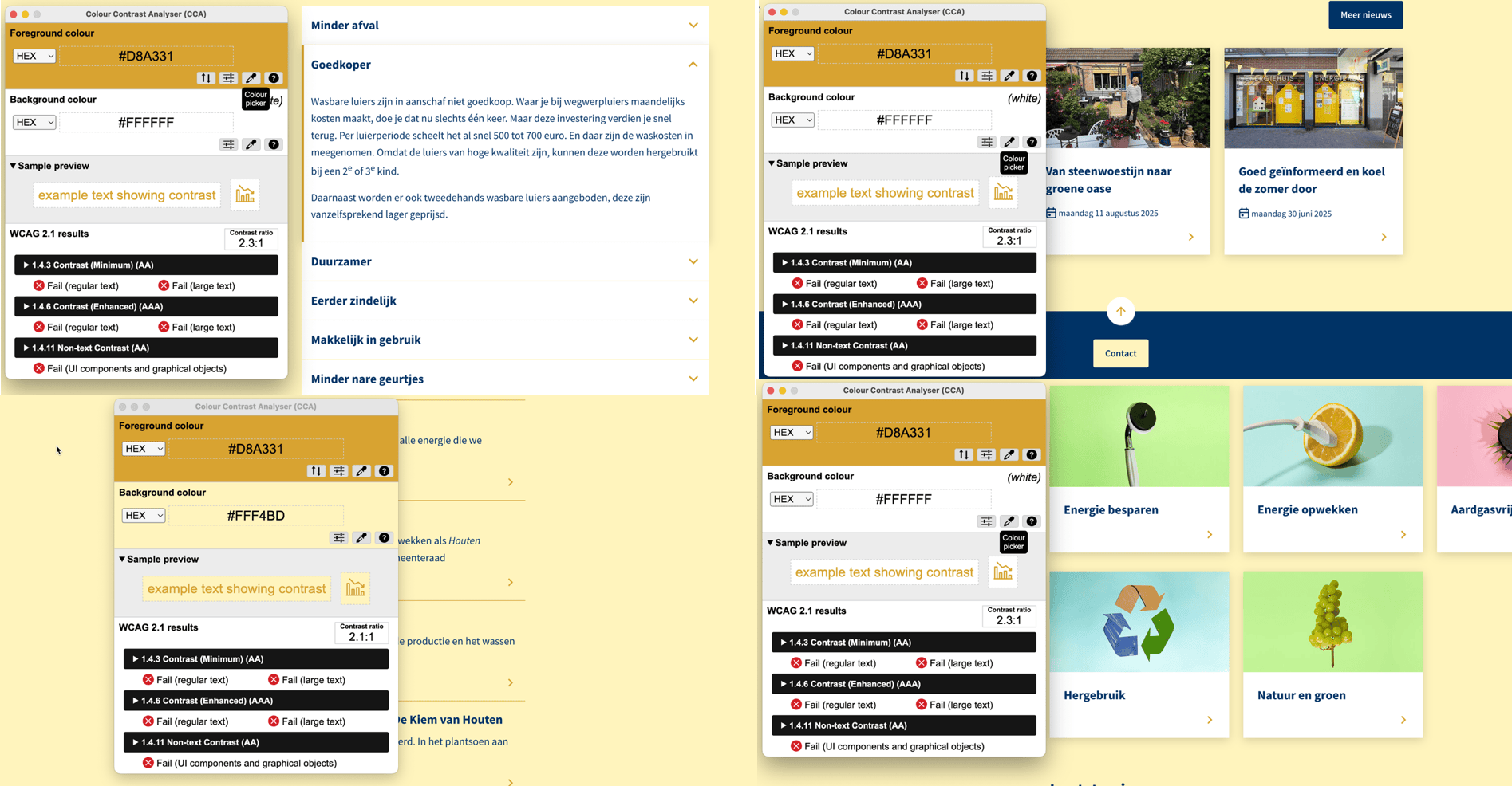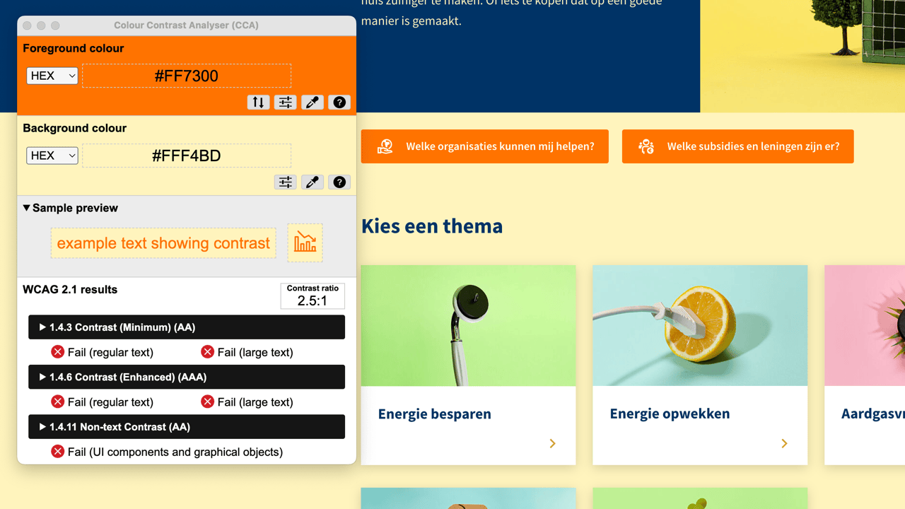 Binnen de site zijn verschillende kleurcombinaties in gebruik die niet voldoen aan de minimale contrastvoorwaarden.