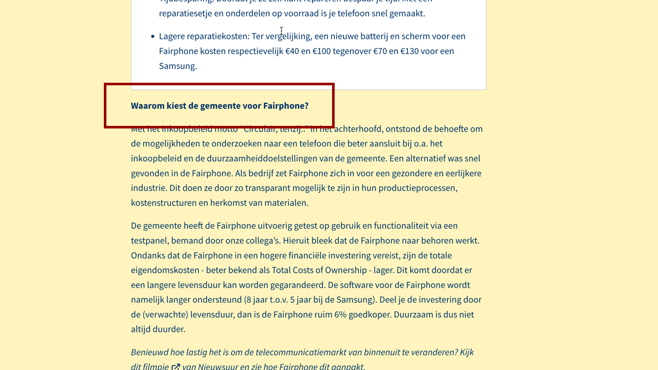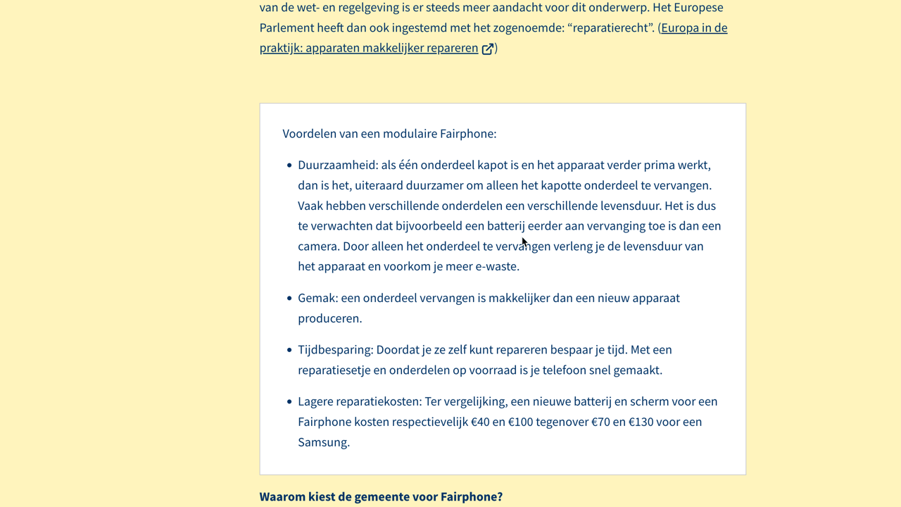 De pagina De beller is sneller, èn nu ook eerlijker! | Duurzaam Houten bevat een soort call-out blok met relevante, maar aparte informatie. Visueel is dit duidelijk, maar er is geen inleidende koptekst voor dit blok met voordelen van de fairphone.