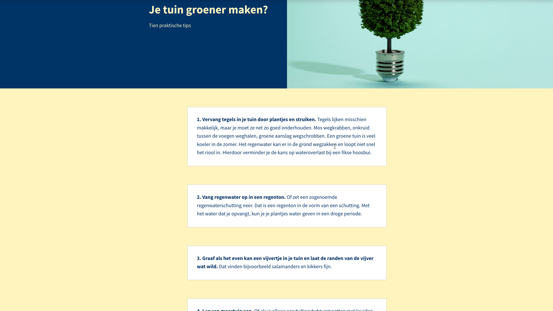 De pagina Tien praktische tuintips | Duurzaam Houten heeft een opsomming met tips. Visueel is structuur aangebracht, door gebruik van individuele witte blokken, maar in de code ontbreekt die structuur. Er zijn verschillende mogelijkheden. Een geordende lijst is op zijn plaats, gezien het gebruik van nummers per stap en de aanduiding dat er 10 tips zijn. De dikgedrukte regels kunnen ook dienen als kopteksten. Pas de content aan, zodat de structuur ook voor screenreaders duidelijk wordt.