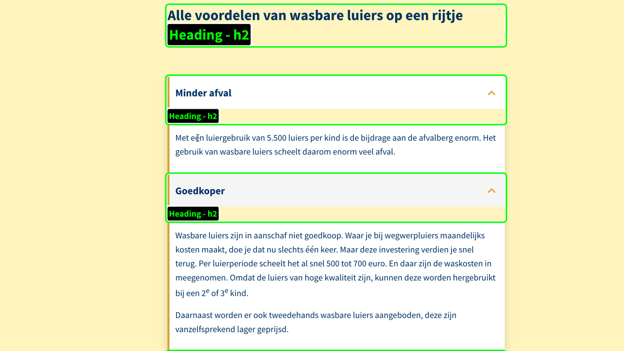 De pagina Wasbare luiers | Duurzaam Houten bevat uitklappers die onder de H2 koptekst Alle voordelen van wasbare luiers op een rijtje zijn gegroepeerd. De uitklappers zijn echter ook opgemaakt met H2 kopteksten, waardoor de structuur van de pagina onjuist wordt. Zorg ervoor dat de uitklappers voorzien worden van een H3 koptekst. Dit kan ingesteld worden in het CMS.