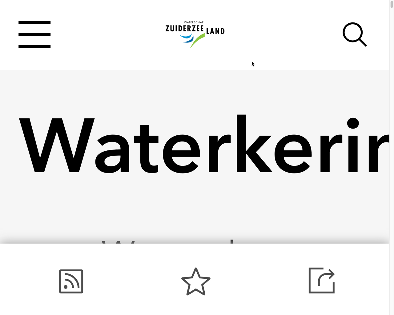 Bij vergroten van de pagina (vanaf circa 175%) wijzigt de zichtbare paginatitel. De oorspronkelijke titel (“Waterschap Zuiderzeeland”) wordt vervangen door een andere titel (“Hub Home”).