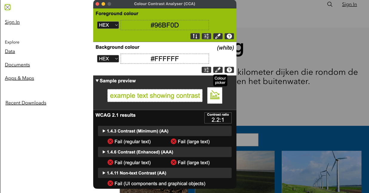 In het zijmenu worden iconen weergegeven in de groene kleur (#96BF0D) op een witte achtergrond (#FFFFFF). De gemeten contrastverhouding bedraagt circa 2.2:1.