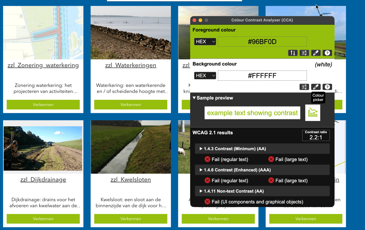 De gemeten contrastverhouding tussen de witte tekst en de groene achtergrond bedraagt circa 2.2:1. Dit voldoet niet aan de minimale contrasteis van 4.5:1 voor normale tekst.