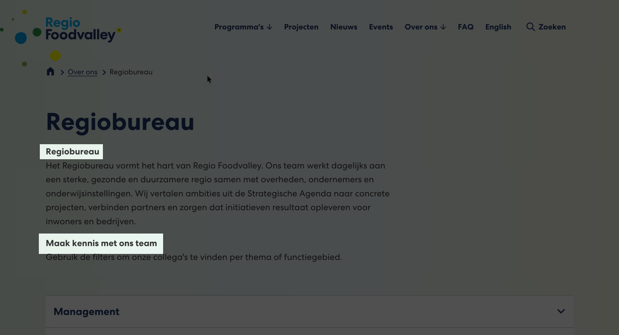 In het voorbeeld zijn teksten zoals “Regiobureau” en “Maak kennis met ons team” visueel opgemaakt als kop, maar deze maken geen deel uit van de programmatische koppenstructuur van de pagina.