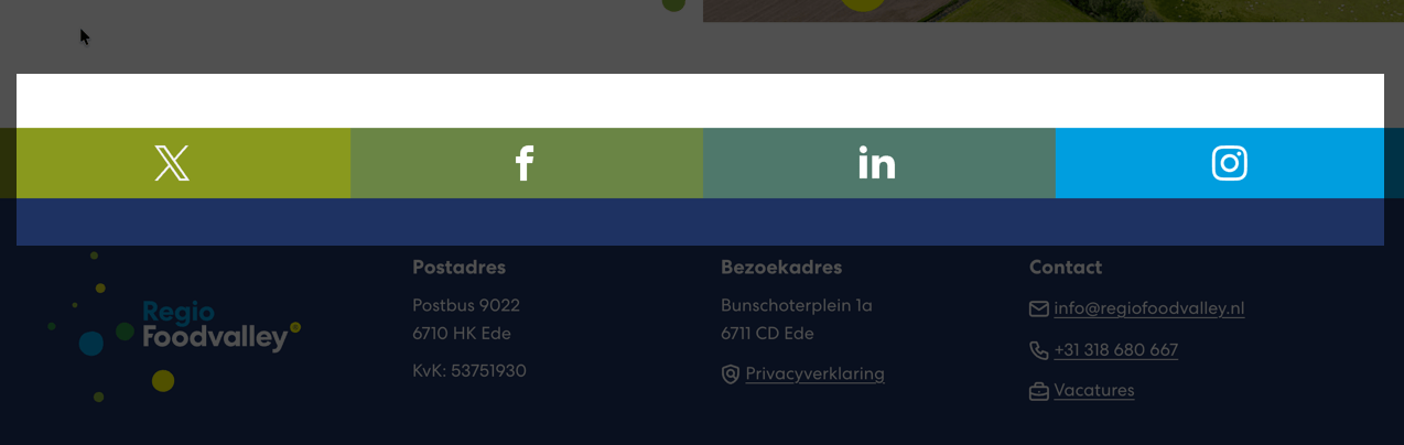 In de footer staan links naar sociale mediakanalen (zoals X, Facebook, LinkedIn en Instagram). Deze links worden visueel weergegeven met het logo van het platform.