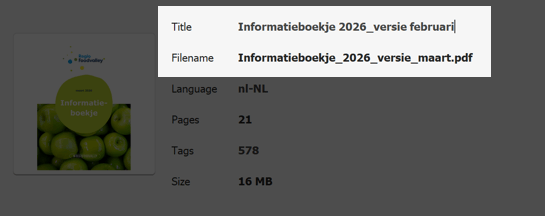 Het PDF-document heeft een ingestelde documenttitel, maar deze bevat onjuiste informatie. De documenttitel in de PDF-eigenschappen vermeldt “Informatieboekje 2026 versie februari”, terwijl op de titelpagina van het document en in de bestandsnaam wordt verwezen naar versie maart 2026.
