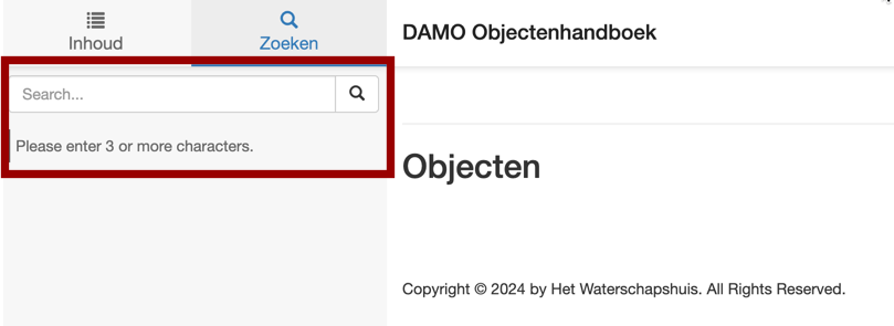 In het DAMO Objectenhandboek is een zoekfunctie waarvan de interface (labels/teksten) in het Engels is weergegeven. De hoofdtaal van de pagina is correct ingesteld op Nederlands, maar dit specifieke onderdeel is niet als Engels gemarkeerd met lang="en".