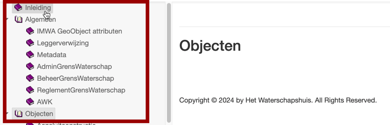 In het boommenu van het DAMO Objectenhandboek (linkerzijde) worden twee lichtgrijze visuele indicatoren gebruikt: één om de huidige pagina in de boomstructuur aan te duiden, en één om de selectie/toetsenbordfocus weer te geven.