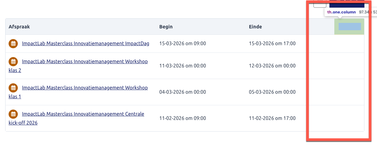 De agenda is opgemaakt als een tabel, maar bevat een volledig lege kolom. Deze kolom heeft geen inhoud of betekenis. Visueel valt dit niet direct op, maar programmatisch is de kolom wel aanwezig.