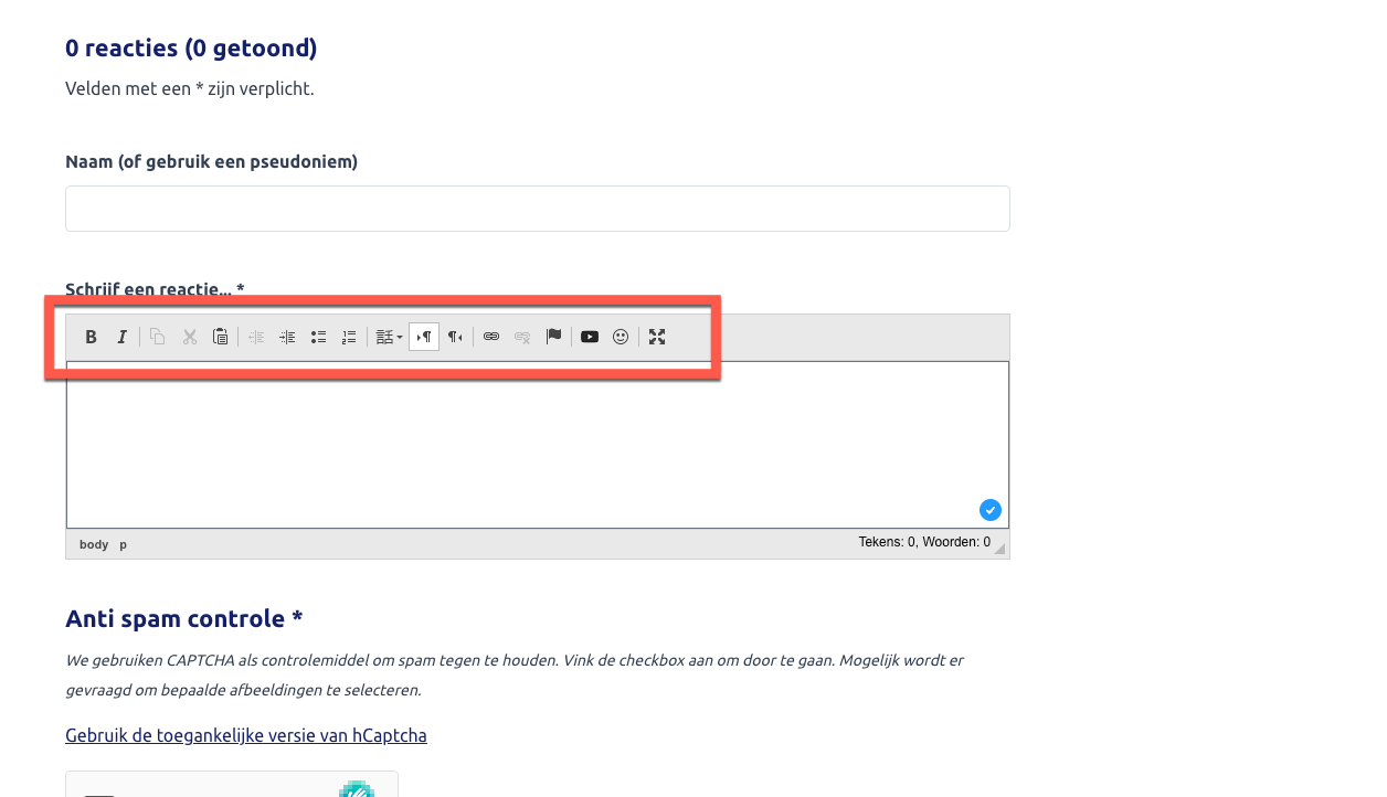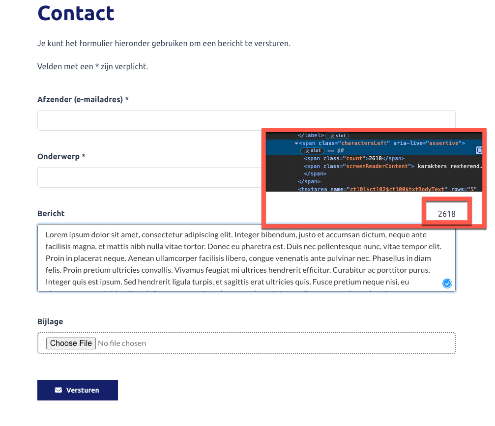 Op de contactpagina bevat het formulier een tekstveld met een karakterlimiet. Updates over het resterende aantal tekens worden via aria-live aan screenreaders doorgegeven. Hierbij wordt echter aria-live="assertive" gebruikt. Hierdoor onderbreekt de screenreader voortdurend de audiofeedback van de tekst die de gebruiker typt, wat leidt tot een onrustige en verwarrende ervaring.