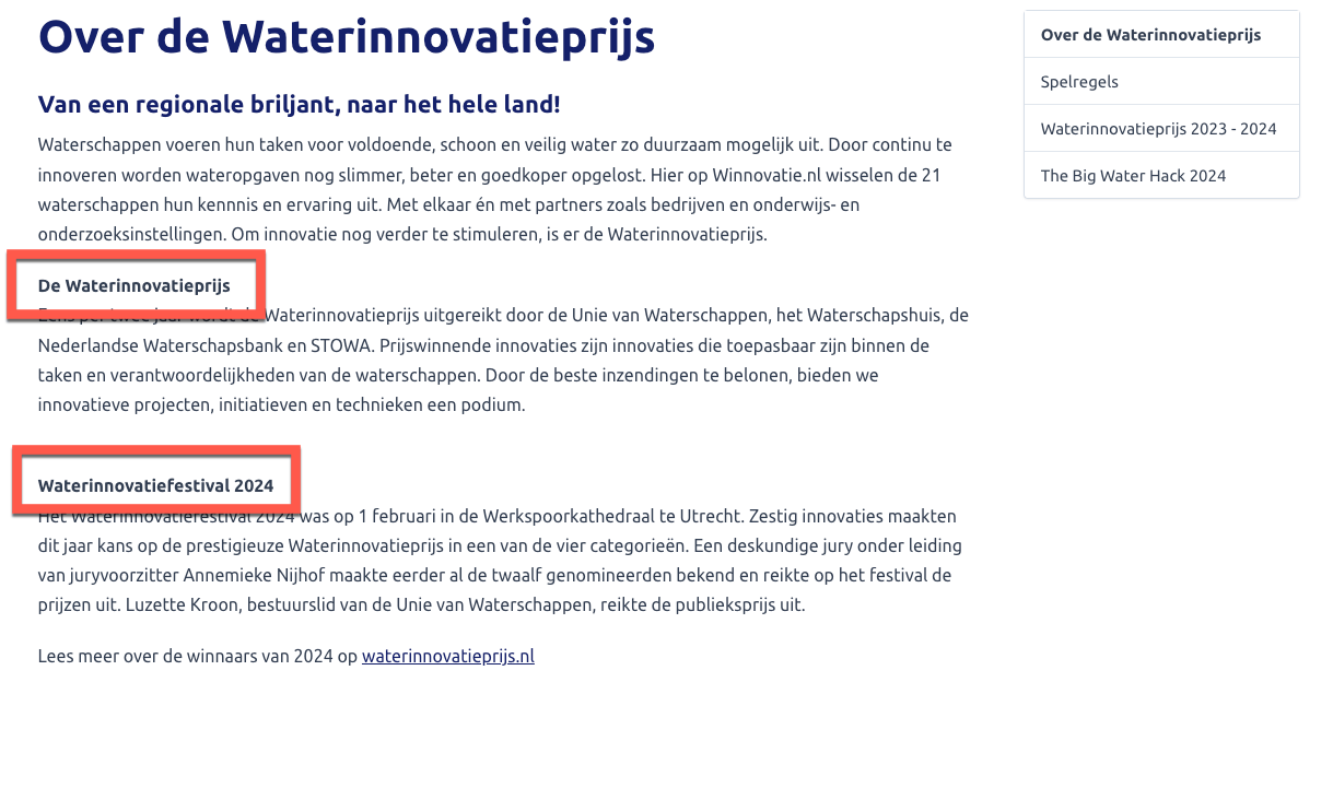 “Nieuws” en “Kalender” zijn opgemaakt als H3, terwijl zij niet onder “Innovaties” vallen en inhoudelijk op hetzelfde niveau staan. Deze zouden H2-koppen moeten zijn.