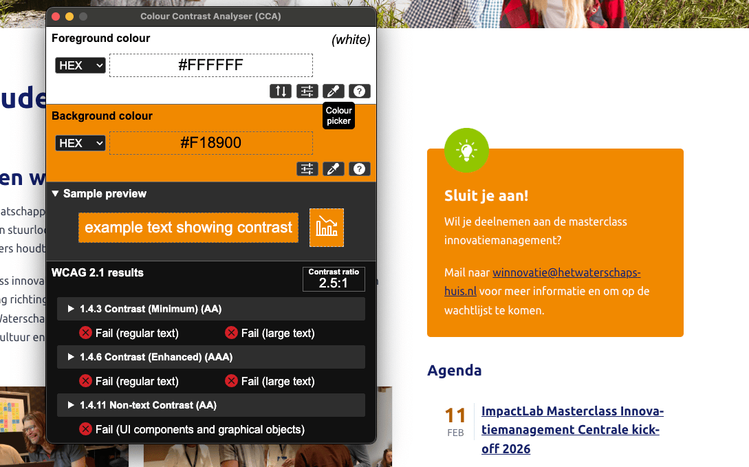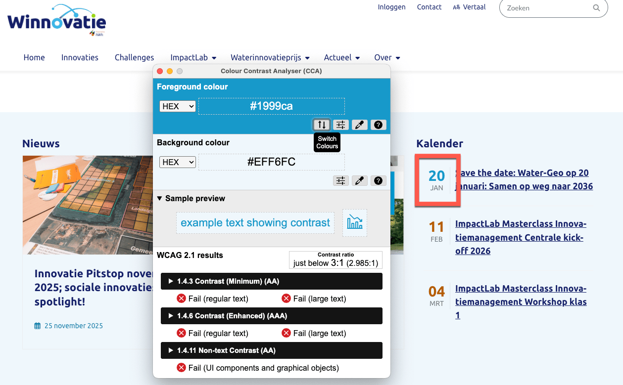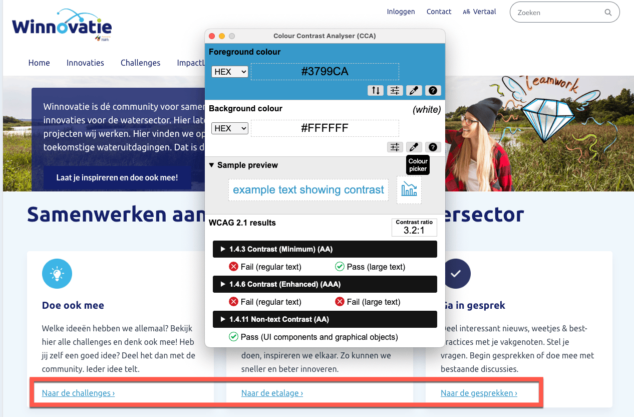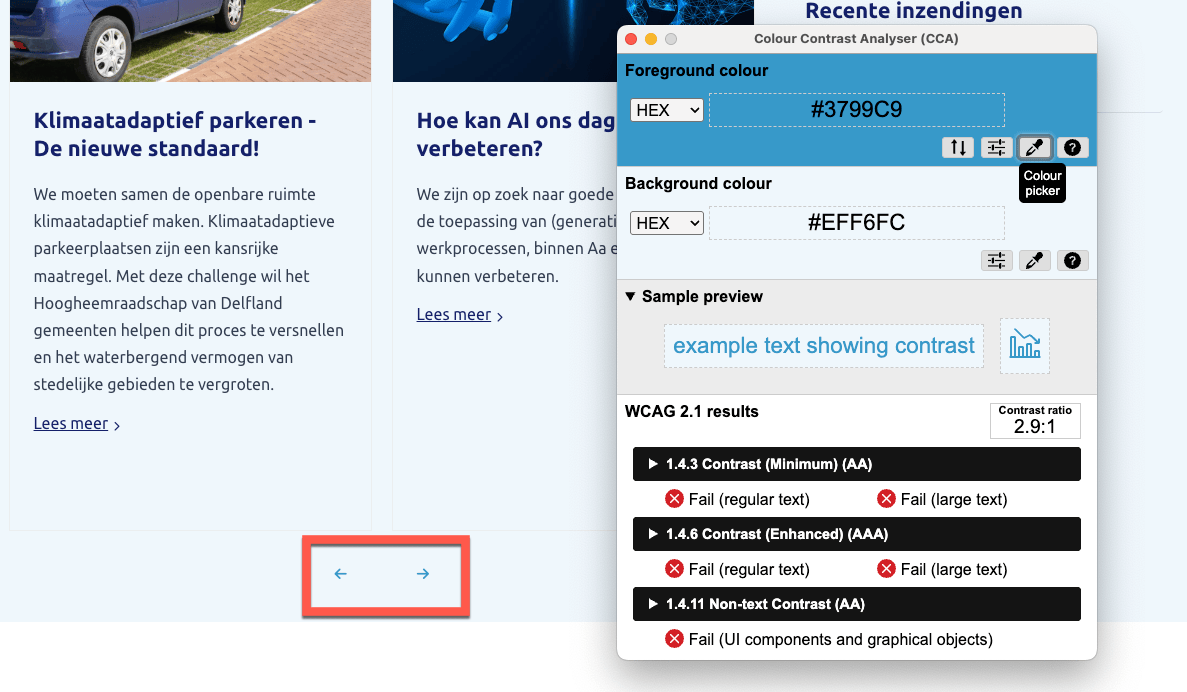 Gemeten is #3799C9 op #EFF6FC voor een contrast van 2.9:1 terwijl de minimumwaarde 3:1 moet zijn.