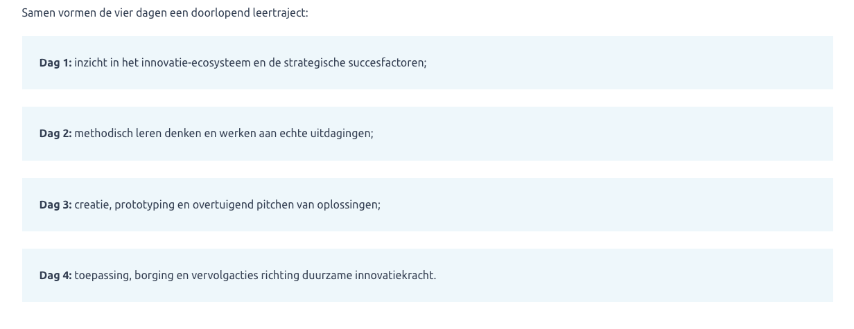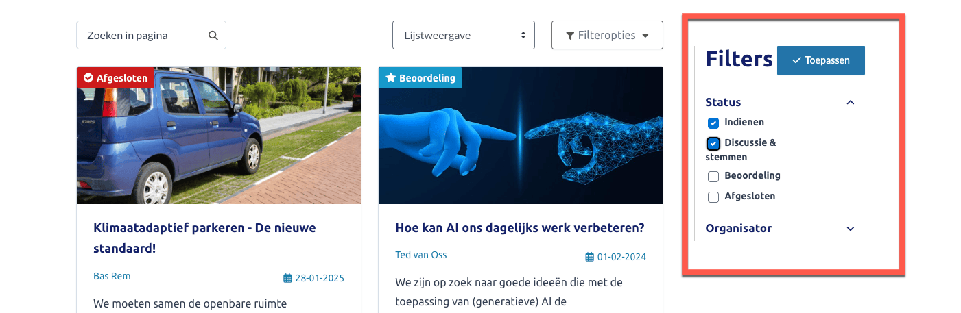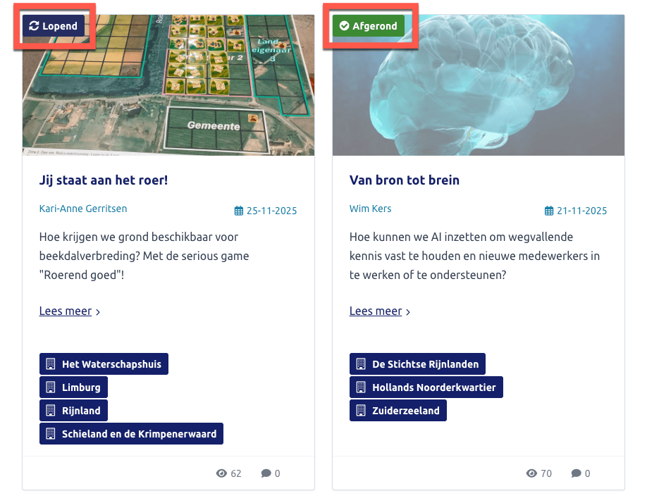 Opmerking: De labels voor innovaties/projecten (bijvoorbeeld statuslabels) worden visueel bovenaan de kaartjes getoond. In de code staan deze labels echter pas helemaal aan het einde van elk kaartje. Voor screenreadergebruikers is de status daardoor pas laat hoorbaar, wat het vergelijken en scannen van kaartjes aanzienlijk lastiger maakt.