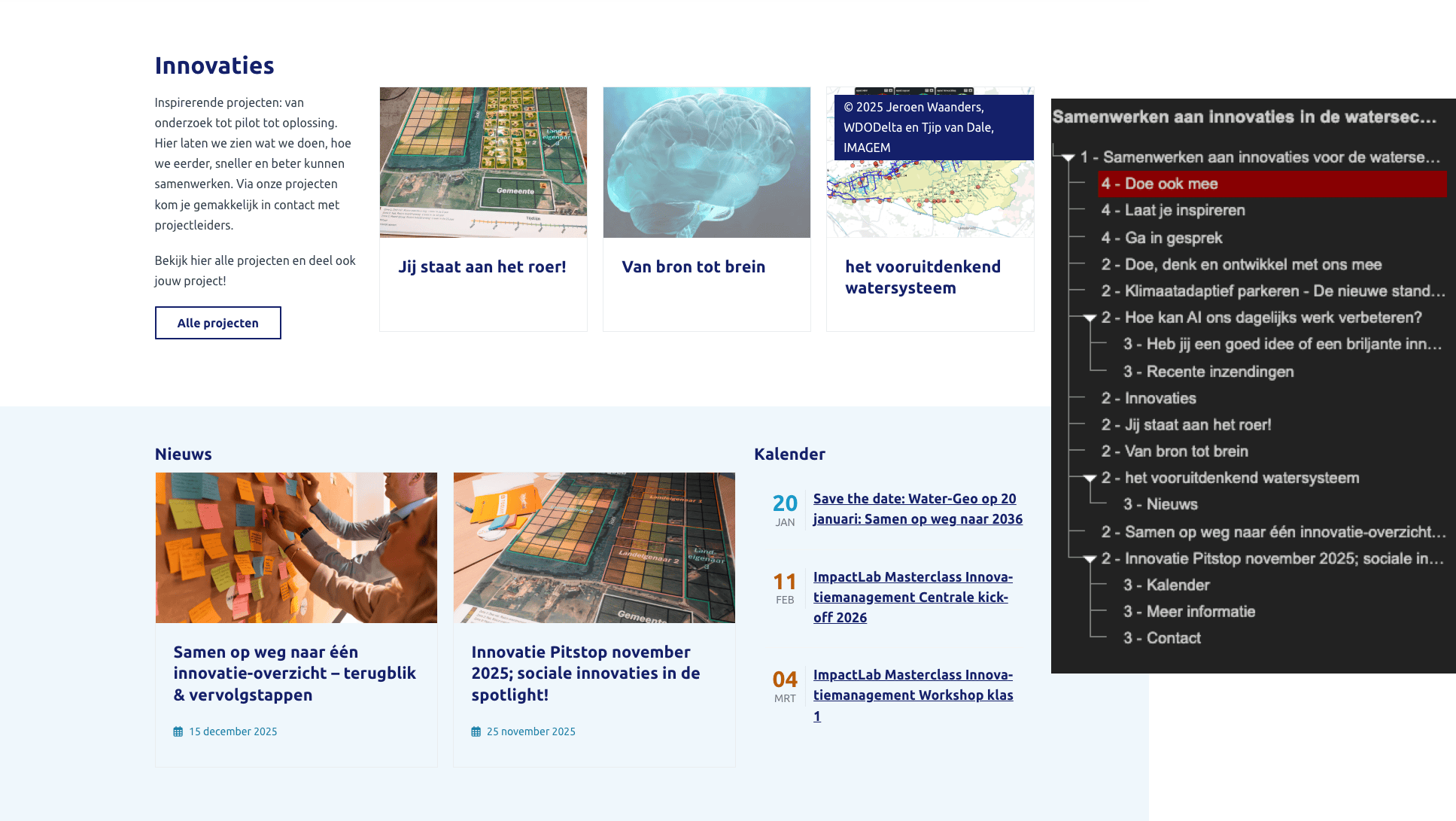 Herstructureer de koppen zodat zij de inhoudelijke opbouw van de pagina volgen. Gebruik H2 voor hoofdsecties (zoals “Innovaties”, “Nieuws” en “Kalender”). Gebruik H3 voor onderdelen die inhoudelijk onder een H2 vallen (zoals individuele innovaties).