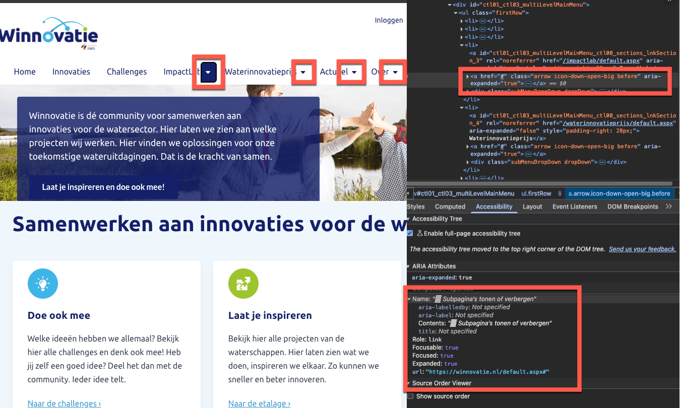Het hoofdmenu bevat uitklapbare submenu’s, maar de statusaanduiding is niet correct geïmplementeerd. Zowel de submenu’s zelf als de bedieningsknoppen bevatten een aria-expanded-attribuut. Dit attribuut hoort uitsluitend op het bedieningselement (de knop) te staan.