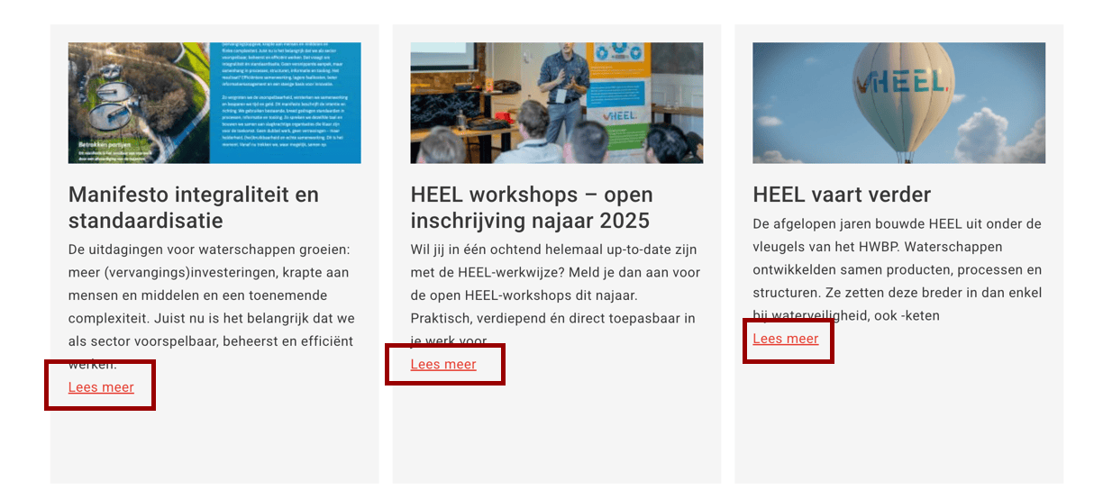 Op de pagina https://heel-nl.nu/nieuws/ bestaat elk kaartje in het overzicht uit een afbeelding, koptekst en introductietekst. De links naar de volledige artikelen gebruiken allemaal dezelfde, generieke tekst: “Lees meer”. Hierdoor is het doel van elke link niet duidelijk zonder de context van de omliggende tekst te lezen.