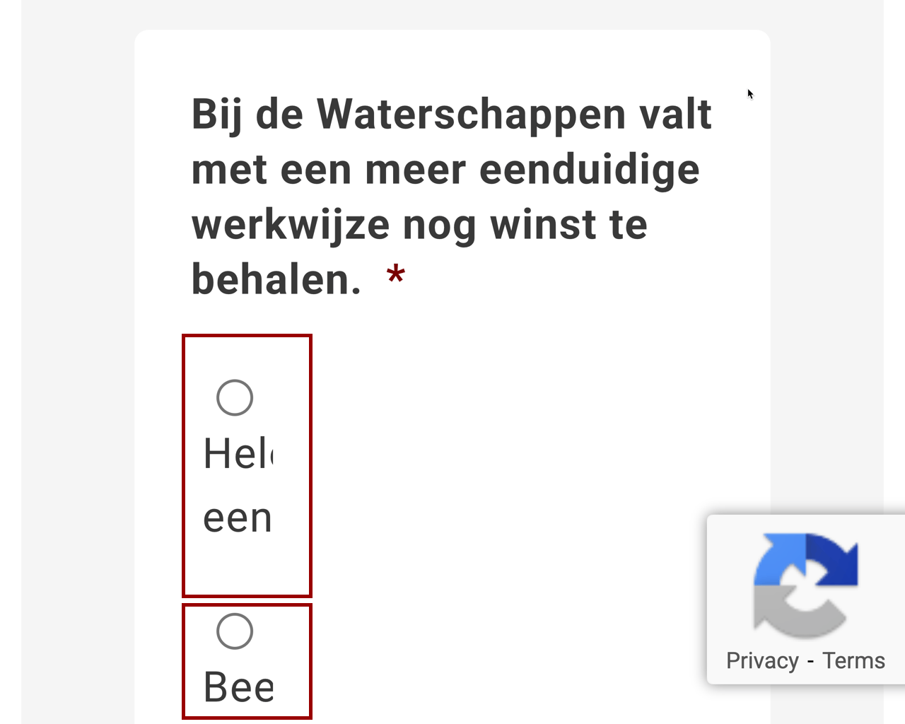 Bij keuzevragen horen meerdere opties logisch bij één vraag. Zonder een fieldset en legend kunnen hulptechnologieën deze relatie niet herkennen en wordt de vraag niet (of onvolledig) aangekondigd bij het doorlopen van de opties.