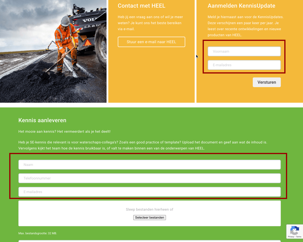 In het formulier op bijvoorbeeld https://heel-nl.nu/help-mee/ hebben invoervelden geen zichtbaar label. Er is wel een programmatisch gekoppeld label aanwezig, maar dit is niet zichtbaar voor gebruikers.