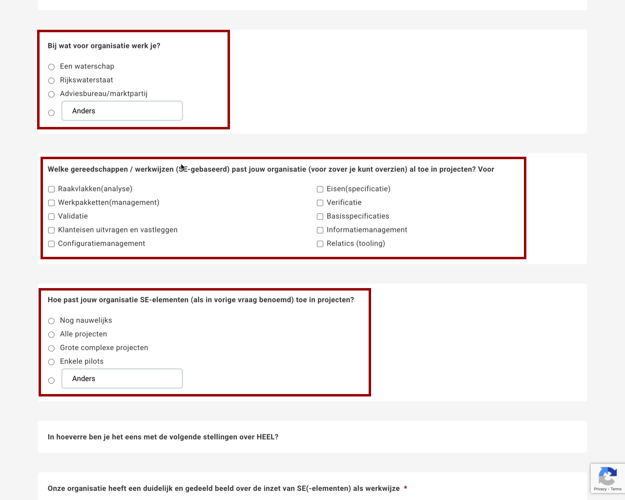 In het enquêteformulier op de pagina https://heel-nl.nu/help-mee/ bestaan meerdere vragen uit groepen checkboxen of radio buttons, maar deze opties zijn niet gegroepeerd met <fieldset> en <legend>. Hierdoor is de onderlinge relatie tussen de opties en de bijbehorende vraag niet programmatisch vastgelegd.