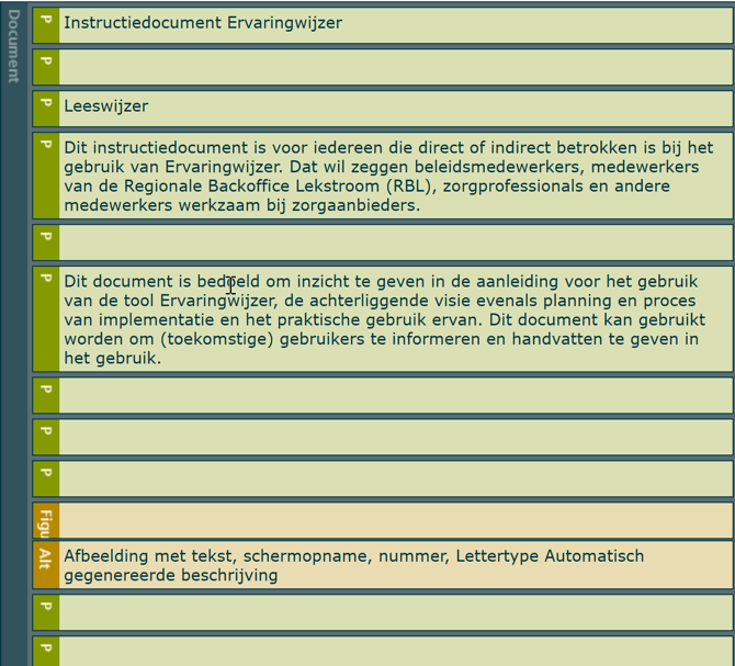 Het document bevat wel codes maar deze codes zijn algemene onjuist. Zo zijn er geen kopteksten aanwezig en zijn lijsten niet juist opgemaakt. Hierdoor is de tekst wel beschikbaar, maar is er geen structuur in het document herleidbaar voor screenreaders.