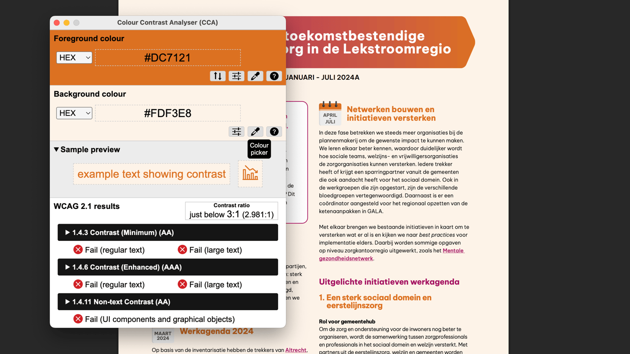 Gemeten is #DC7121 (oranje) op #FDF3E8 (licht oranje) voor een contrast van 2.981:1. Dit is helaas net niet voldoende om aan de minimale eis van 3:1 te voldoen voor grote of dikgedrukte tekst.