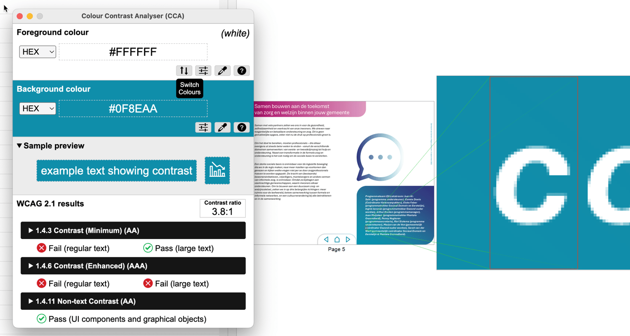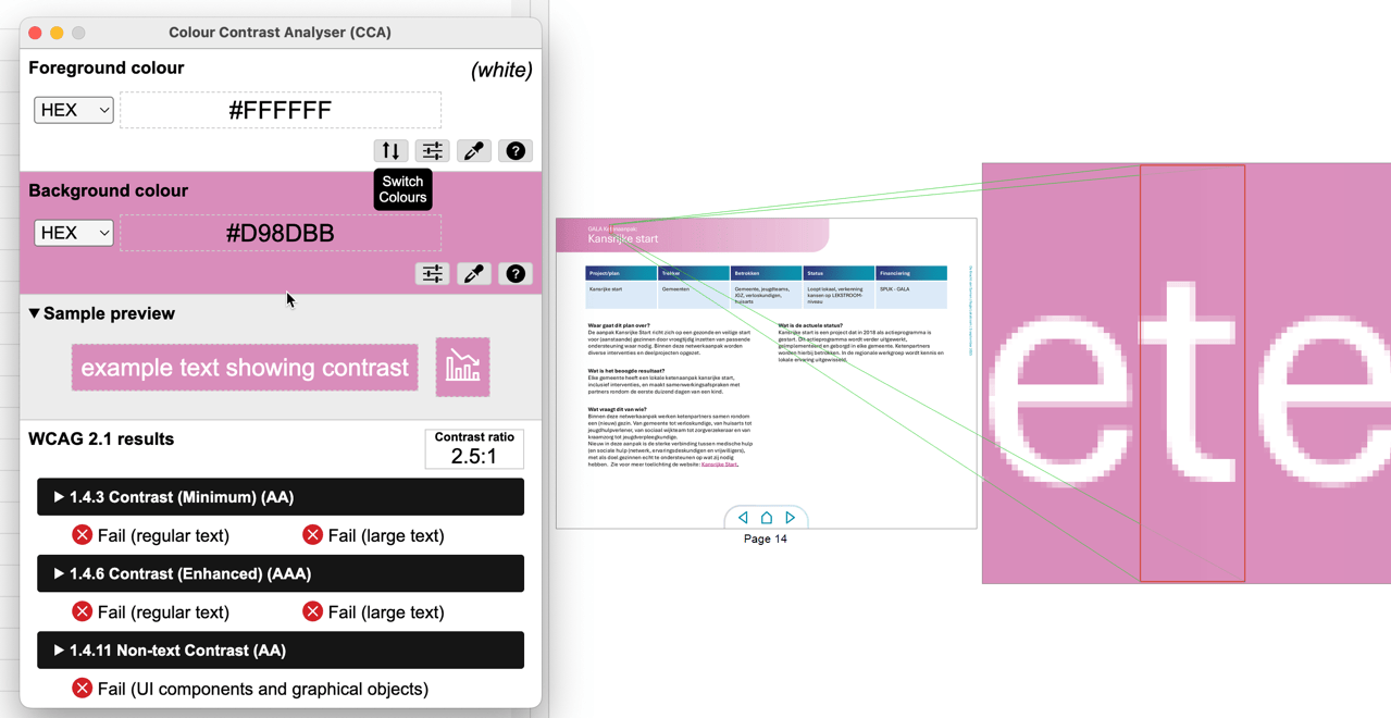 In het document https://www.regiolekstroom.nl/fileadmin/houten_regiolekstroom/Programmas/250905_Overzicht_transformatieve_plannen_regio_Lekstroom.pdf zitten kleurcombinaties voor tekst die niet voldoen aan de minimum contrast eisen.