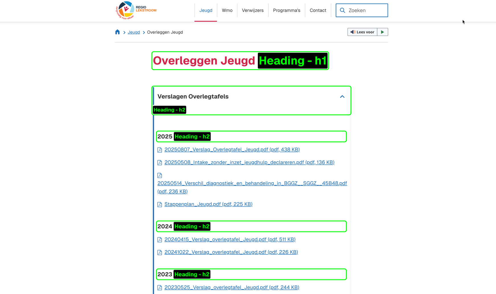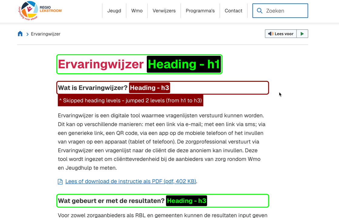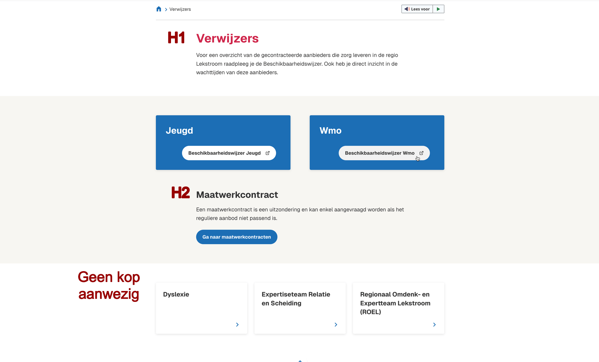 De pagina Verwijzers | Regio Lekstroom bevat een laatste sectie met drie links. Deze sectie heeft geen eigen koptekst ter introductie. Hierdoor valt de tekst programmatisch onder de voorgaande kop Maatwerkcontract, maar deze links hebben hier geen contextuele relatie mee. Zorg dat de visuele onderscheid door de afstand en andere kleur sectie, ook programmatisch duidelijk is door het toevoegen van een koptekst.