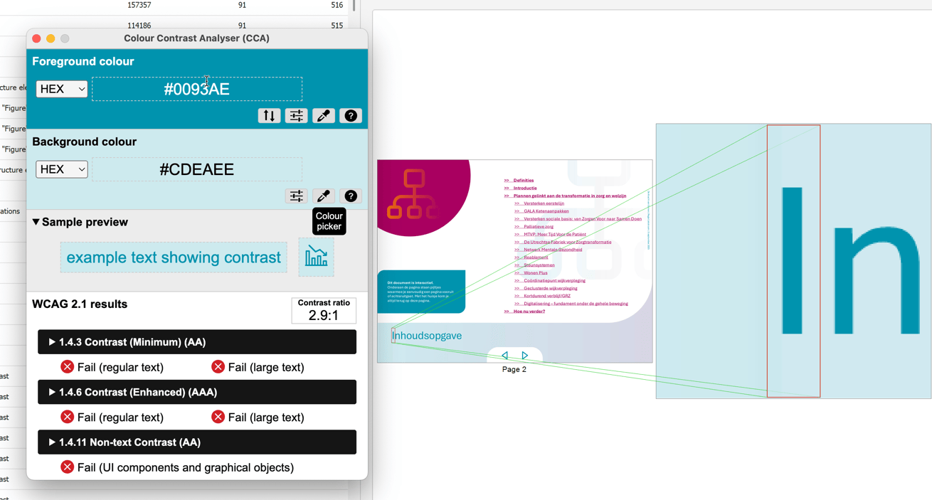 Toch kwamen tijdens het onderzoek enkele knelpunten naar voren. Zo ontbreken bij sommige afbeeldingen alternatieve teksten, is de kopstructuur niet altijd logisch opgebouwd, en voldoen bepaalde kleurcombinaties in documenten niet aan de vereiste contrastwaarden. Daarnaast zijn de onderzochte pdf-bestanden slechts gedeeltelijk toegankelijk; sommige missen tags of hebben een verkeerde taalinstelling, wat het gebruik met hulptechnologie bemoeilijkt.