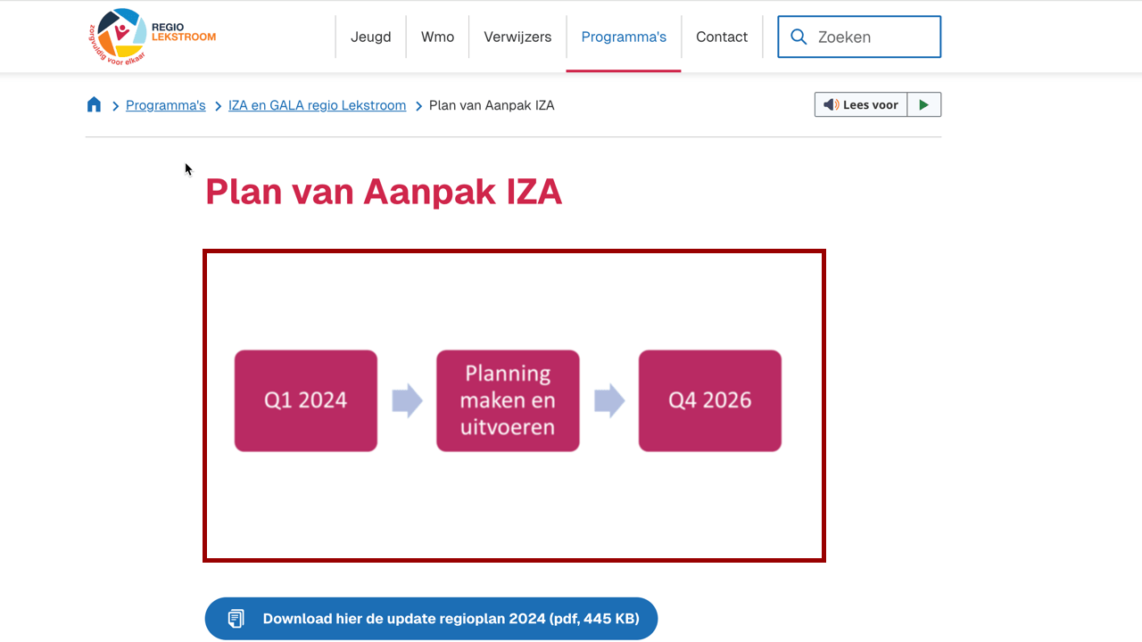 Op de pagina Plan van Aanpak IZA | Regio Lekstroom staat een afbeelding van een korte tijdlijn, maar deze informatie wordt niet via een alternatieve tekst ontsloten.