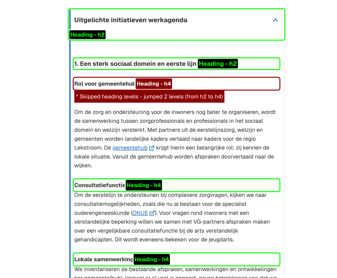 Binnen veel pagina's op de site klopt het programmatische niveau van de kopteksten (h1, h2, h3, etc) niet met de tekst. Het komt regelmatig voor dat kopniveaus worden overgeslagen, bijvoorbeeld van een H1 naar een H3, of juist niet van een H2 naar een H3 gesprongen wordt. Dit gebeurt zowel in lopende pagina's als ook vaak met het gebruik van uitklappers, waarbij zowel de uitklapper zelf als de koppen erin een H2 hebben.