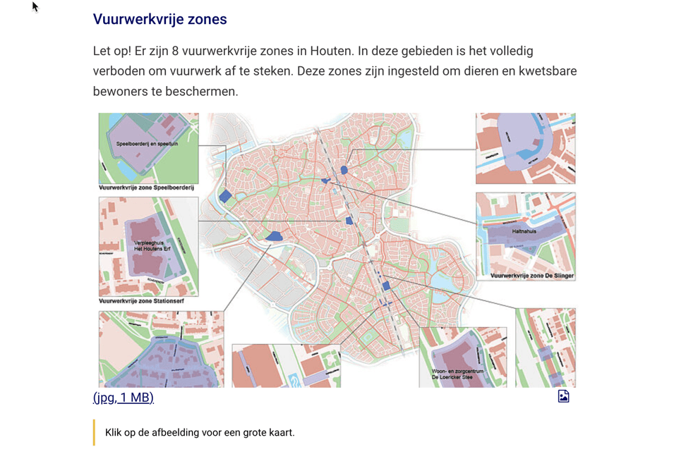 Op de pagina https://www.houten.nl/gemeentelijke-organisatie/melding-doen/vuurwerk staat een kaartje van vuurwerkvrije zones binnen Houten. Het tekstalternatief voor deze afbeelding is Vuurwerkvrije zones in Houten tijdens jaarwisseling 2024/2025 (jpg, 1 MB). Hiermee wordt niet dezelfde informatie gegeven als via de afbeelding. Deze informatie is ook niet ergens anders op de pagina beschikbaar.