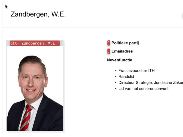 Op de profielpagina's worden foto's getoond van de raadsleden. Deze foto's hebben als alternatieve tekst de achternaam en voorletters van de persoon. Daarmee komt de informatie in de alt tekst niet overeen met de informatie rond het uiterlijk van de persoon zoals die visueel waargenomen kan worden.