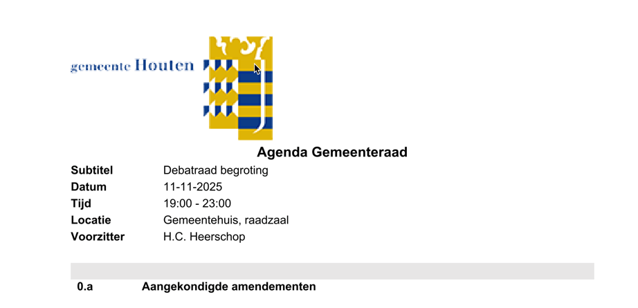 Het document Document Houten - 2025-11-11 Gemeenteraad Agenda 11 november 2025 - iBabs Publieksportaal bevat bovenaan het logo van de gemeente. Dit logo heeft geen tekstalternatief, maar heeft dit wel nodig, omdat het (ook visueel) helpt de eigenaar van het document vast te stellen.